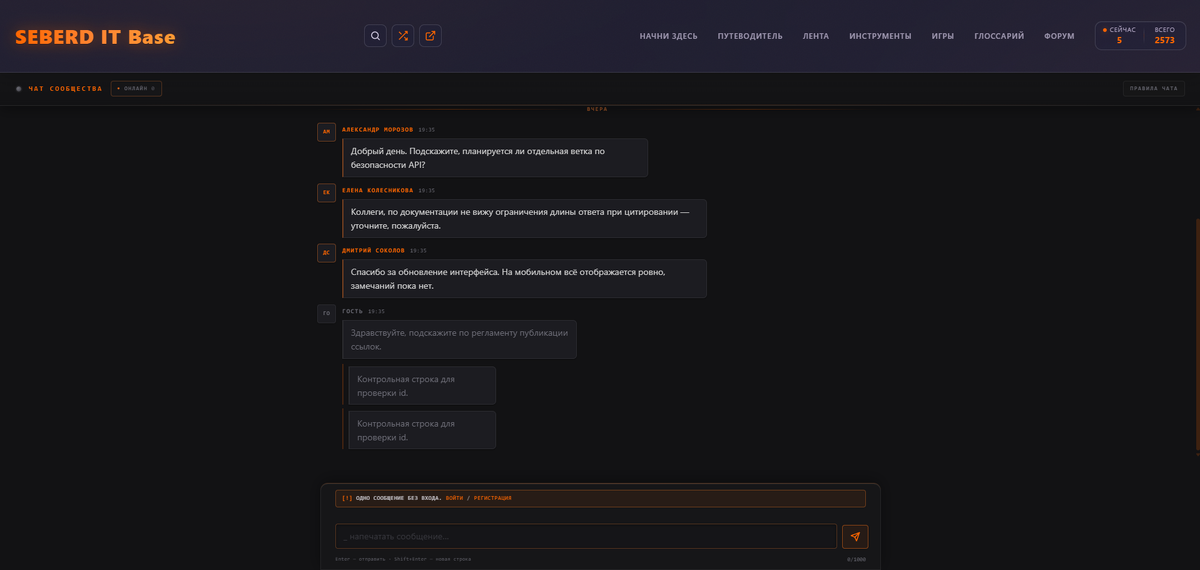 Чат сообщества позволяет написать одно сообщение без регистрации. Просто зайти и спросить. Иногда человеку нужно задать один вопрос, и требовать ради этого создавать аккаунт — лишний барьер. Одно сообщение достаточно, чтобы начать диалог. Многоступенчатая проверка на спам исключает очевидные злоупотребления. До этого сообщений было гораздо больше, почти все на английском и ссылками на вредоносные ресурсы.