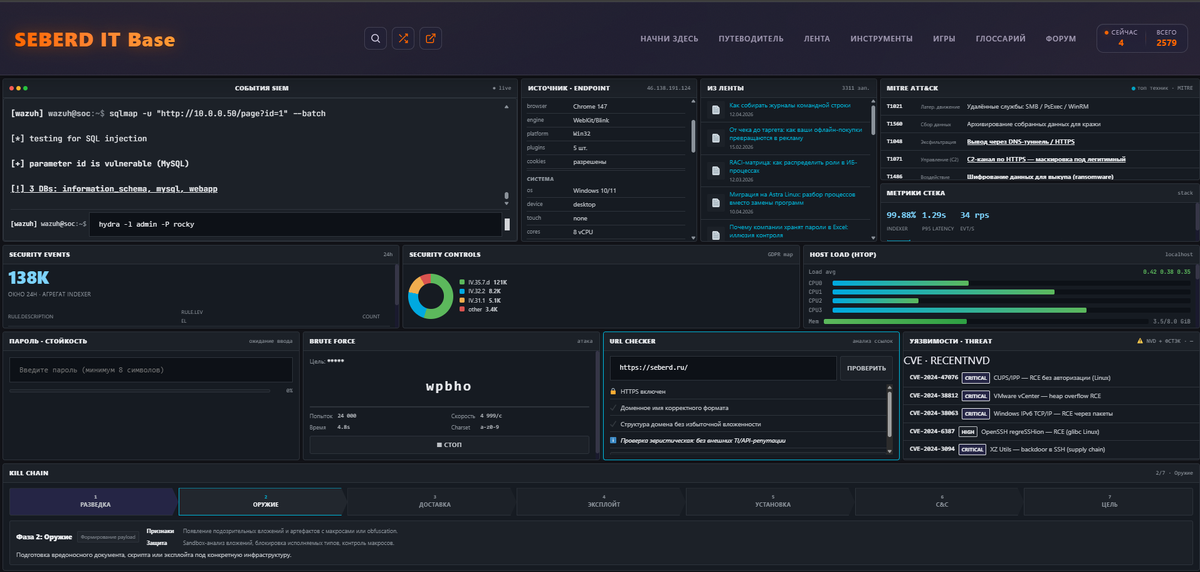 Не статичную библиотеку, которую читают и закрывают. Живой ресурс, где что-то происходит каждый день. Угрозовая картина обновляется в реальном времени, а не раз в квартал. Можно зайти и в браузере, без установки, пройти пошагово через раунды AES или посмотреть, как работает Kerberoasting. Можно задать вопрос без создания аккаунта.