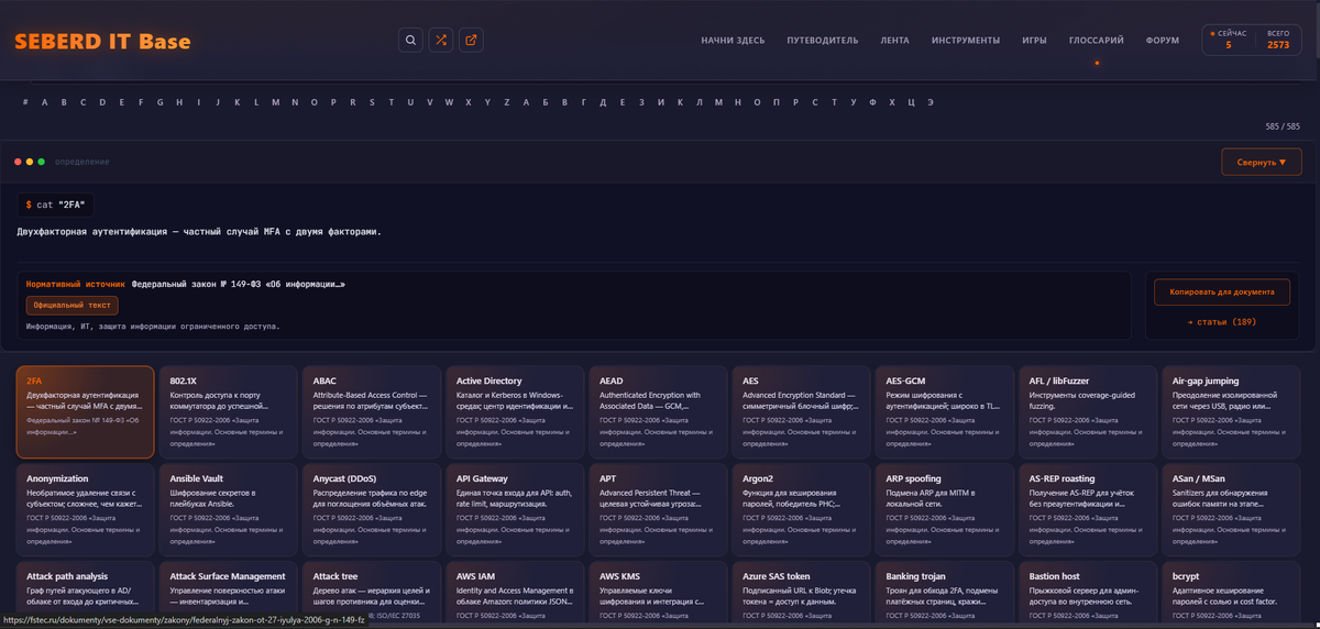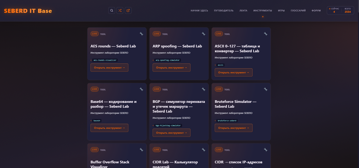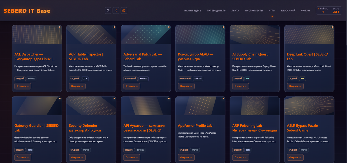 Что требует доработки. Карточки инструментов и игр почти не имеют описаний. Под каждым заголовком написано только «Инструмент лаборатории SEBERD» или «Мини-игра по теме ИБ». Поиск и категоризация внутри этих разделов не реализованы полноценно. Глоссарий содержит 89 терминов. В одной только теме Windows-аутентификации их можно насчитать десятки.