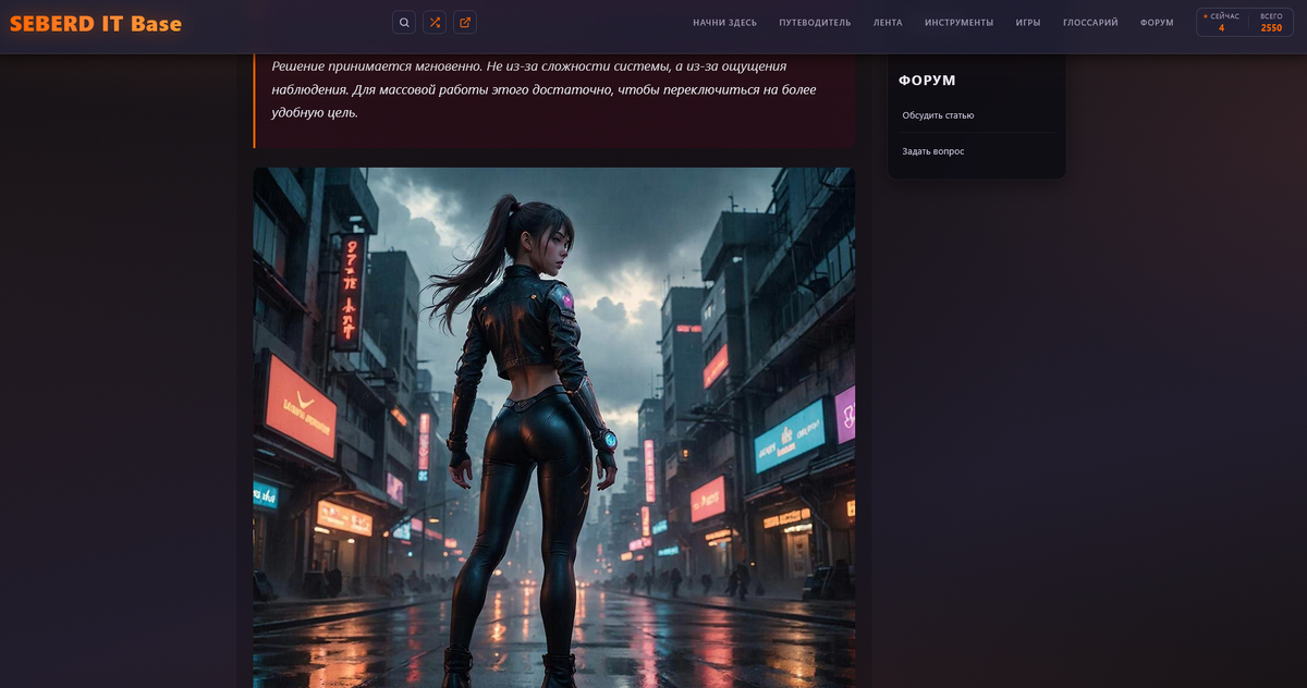 При этом я понимаю, что один человек не может сделать всё. Отсюда AI в пайплайне, открытый форум, чат без регистрации. Если люди, которые лучше меня разбираются в конкретных темах, захотят участвовать, будет только лучше.