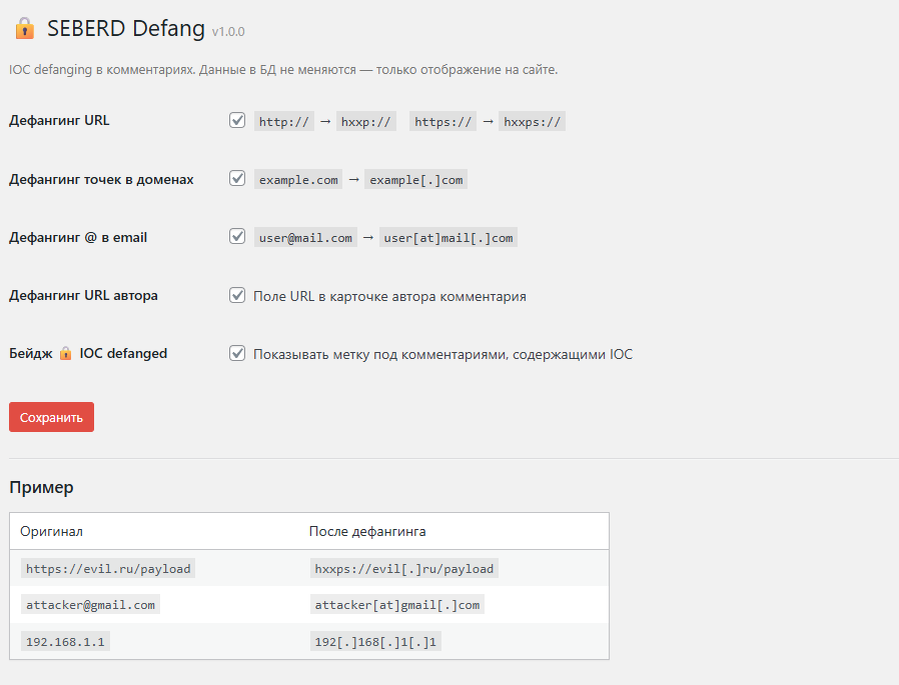В базе он хранится как есть, меняется только отображение. http/https превращаются в hxxp/hxxps, точки в доменах — в [.], символ @ — в [at]. Пример: https://malware.example.com/payload на экране становится hxxps://malware[.]example[.]com/payload.