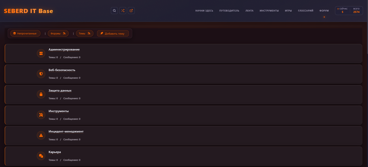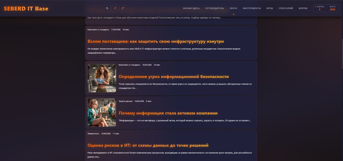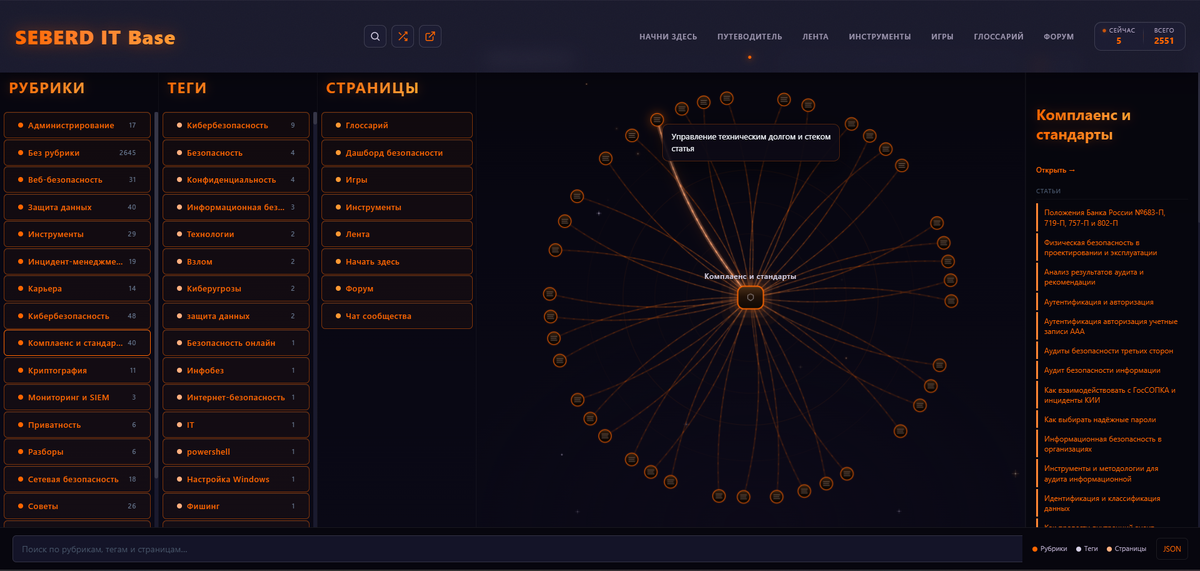 Раздел «Путеводитель» построен на технологии графов. Каждая рубрика, тег и страница представлены как узел. Между ними показаны связи. Как «Социальная инженерия» пересекается с «Веб-безопасностью». Как «Мониторинг и SIEM» связан с «Инцидент-менеджментом». Как конкретная статья тянет за собой несколько смежных тегов.