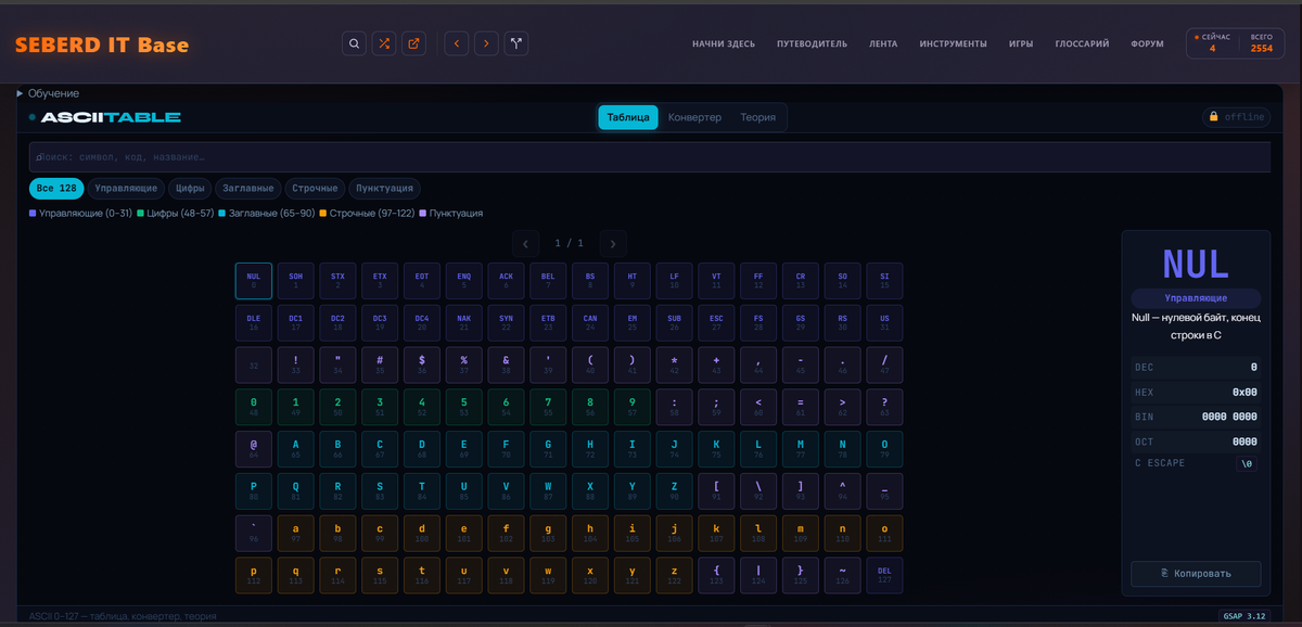 Утилиты общего назначения: генератор паролей, оценщик стойкости пароля, калькулятор энтропии, хеш-калькулятор, chmod-калькулятор, regex-тестер, Base64, URL encoder/decoder, HEX/ASCII/Binary конвертер, JSON Formatter, Cron-декодер, Unix Timestamp, User-Agent Parser, Fingerprint Viewer, ASCII-таблица, конвертер систем счисления, морзянка, QR-генератор и декодер, Diff-просмотрщик.