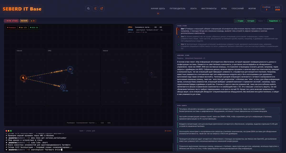 Результат выглядит так. Интерактивная схема сети с зонами Internet, DMZ и Internal. Анимированный вектор атаки. Терминал с реальными командами разведки. Поэтапное описание техники: разведка, анализ уязвимостей, эксплуатация. Развёрнутое объяснение механики и конкретные меры защиты. Тип атаки привязан к MITRE ATT&CK. Уровень риска выведен явно. Это не дайджест в духе «очередную компанию взломали». Это разбор техники с пониманием того, как она работает изнутри. Счётчик в правом верхнем углу показывает посетителей онлайн сейчас и общее число за всё время.