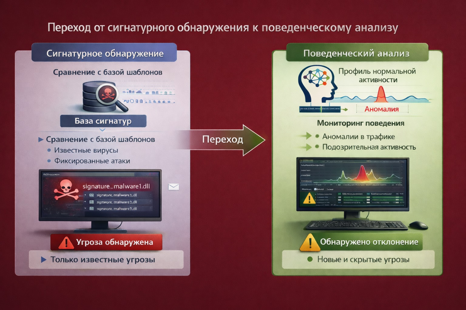 [ИЗОБРАЖЕНИЕ: Диаграмма, показывающая переход от сигнатурного обнаружения (сравнение с базой шаблонов) к поведенческому анализу (построение профиля нормальной активности и флагирование отклонений).]